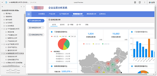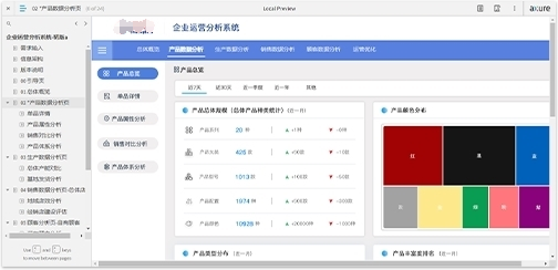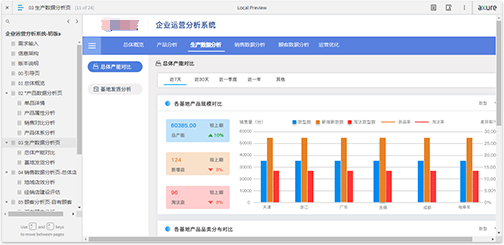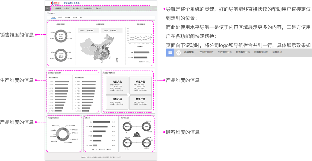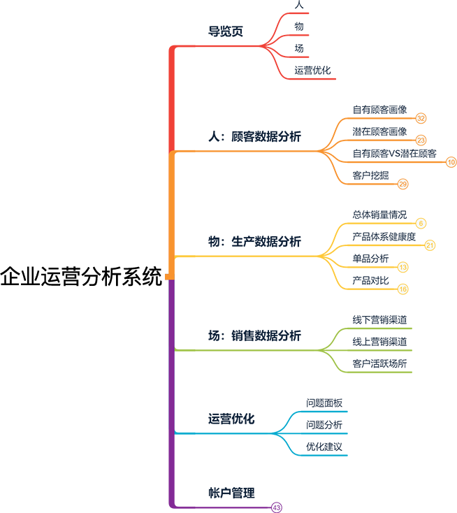 《企业运营分析系统》,本产品是由之前设计过的一个客户定制化项目提炼出来的通用型产品,可匹配多个行业。主要针对产品、生产基地、经销商以及顾客,即人、物、场三大方面进行数据化分析并给出科学决策建议;主要功能有产品数据分析、顾客数据分析、销售数据分析、生产数据分析,以及结合数据分析给出的运营优化功能;