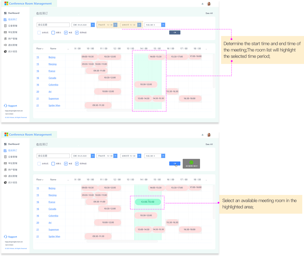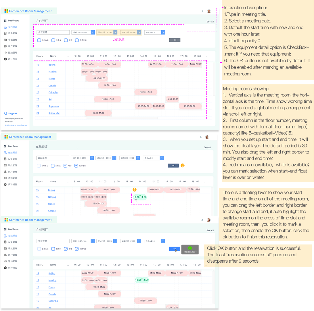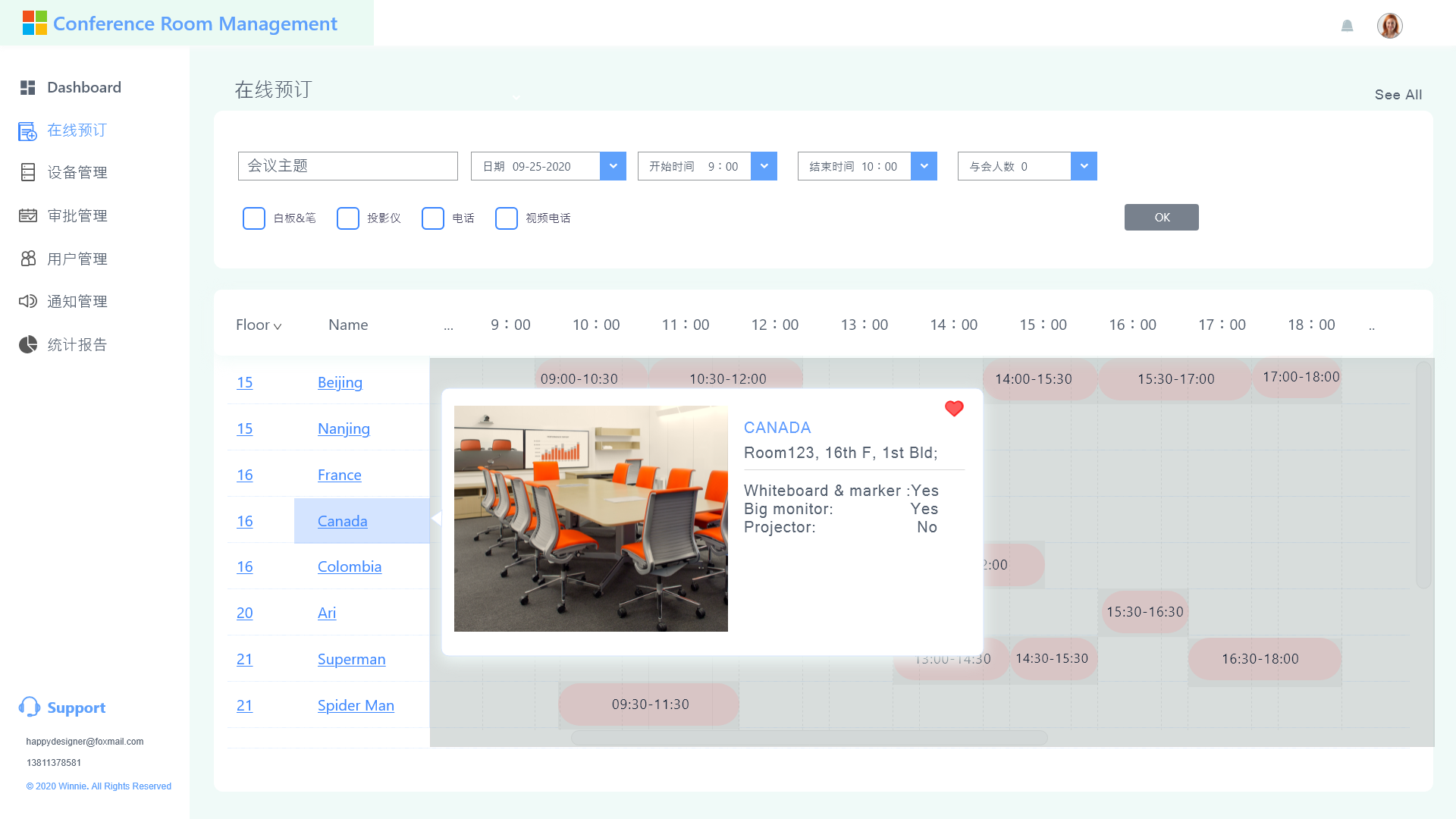 Aiming at the scenario of employees booking room offline or preempting meeting rooms, build a system to search for meeting rooms online and one-click reservations. Simplify the booking process, resolve inefficient pain so that employees can view the usage status relax. Conference room management system let the meeting room managers maintain the meeting room easily, effectively track the utilization so that the meeting room resources can be used reasonably; anywhere use it like computer browser, mobile phone WeChat applet for appointment and management;